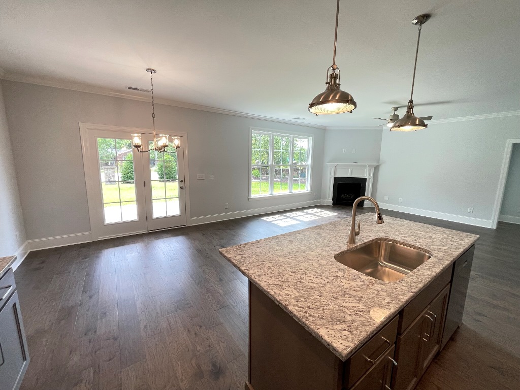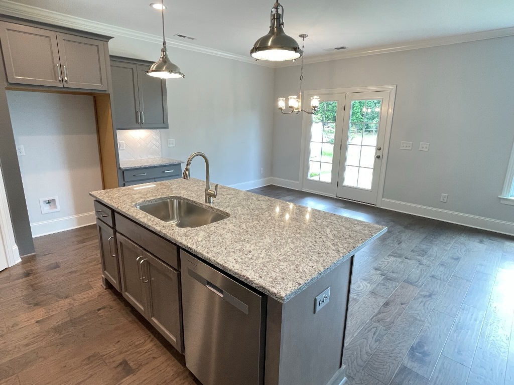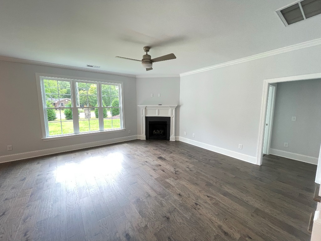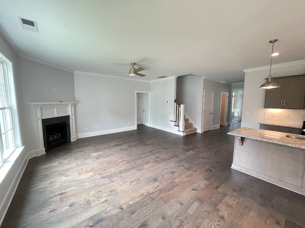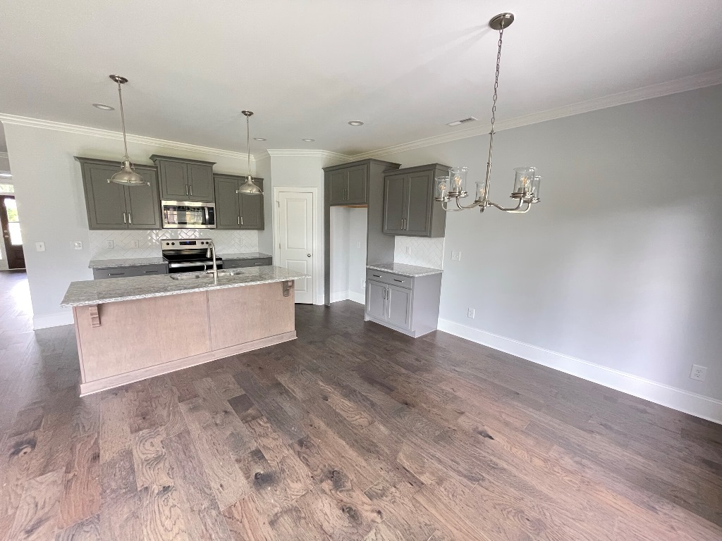 This gorgeous home sits on a corner lot and features all major stainless appliances including smooth top range, built in microwave, garbage disposal, dishwasher and a grand kitchen pantry. Open floor plan with covered front porch & patio, fireplace w/gas logs (tenant responsible for gas hookup & usage), large laundry room, two car garage and mud room with bench seating, coat rack & storage. The kitchen cabinetry, tiled back splash, center island and granite counter tops offer this kitchen a truly exquisite look. Downstairs Master Suite has large bath with beautiful tile flooring, double vanity, walk-in shower & walk-in closet. Second downstairs bedroom is conveniently situated beside the full guest bath. Upstairs has 2 bedrooms, bonus room, floored attic space, HUGE walk-in closet & full bath. Electric central heat & air.